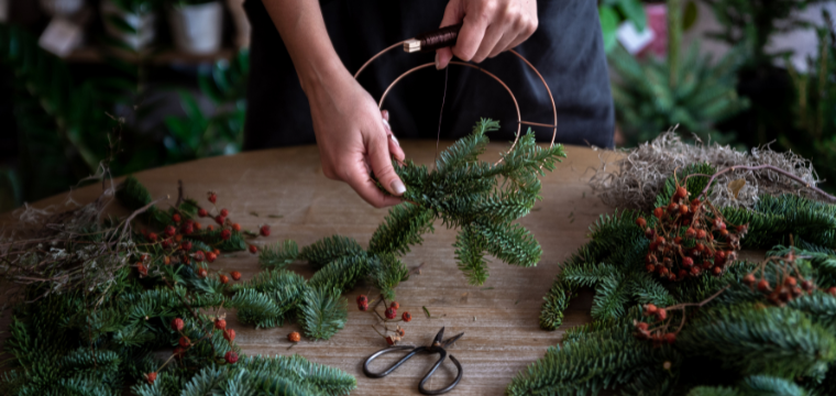 Book your own private wreath making class for up to 12 adults! Join in the fun of creating your own natural holiday wreath from scratch on a 14 inch frame. In this class designed for adults, you will attach evergreens and embellishing with a wide variety of natural materials and a bow if you wish. All supplies will be furnished; however, you are welcome to bring items to add to your creation. Examples, instructions, assistance and materials will be provided.