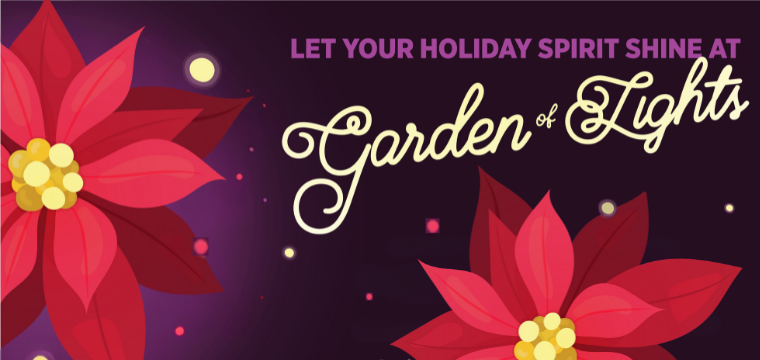 This is a timed admission event with entry from 5 p.m. to 7:30 p.m. nightly. Entry gates close at 8 p.m. and the event ends at 9 p.m. Garden of Lights is closed on Christmas Eve and Christmas Day.
